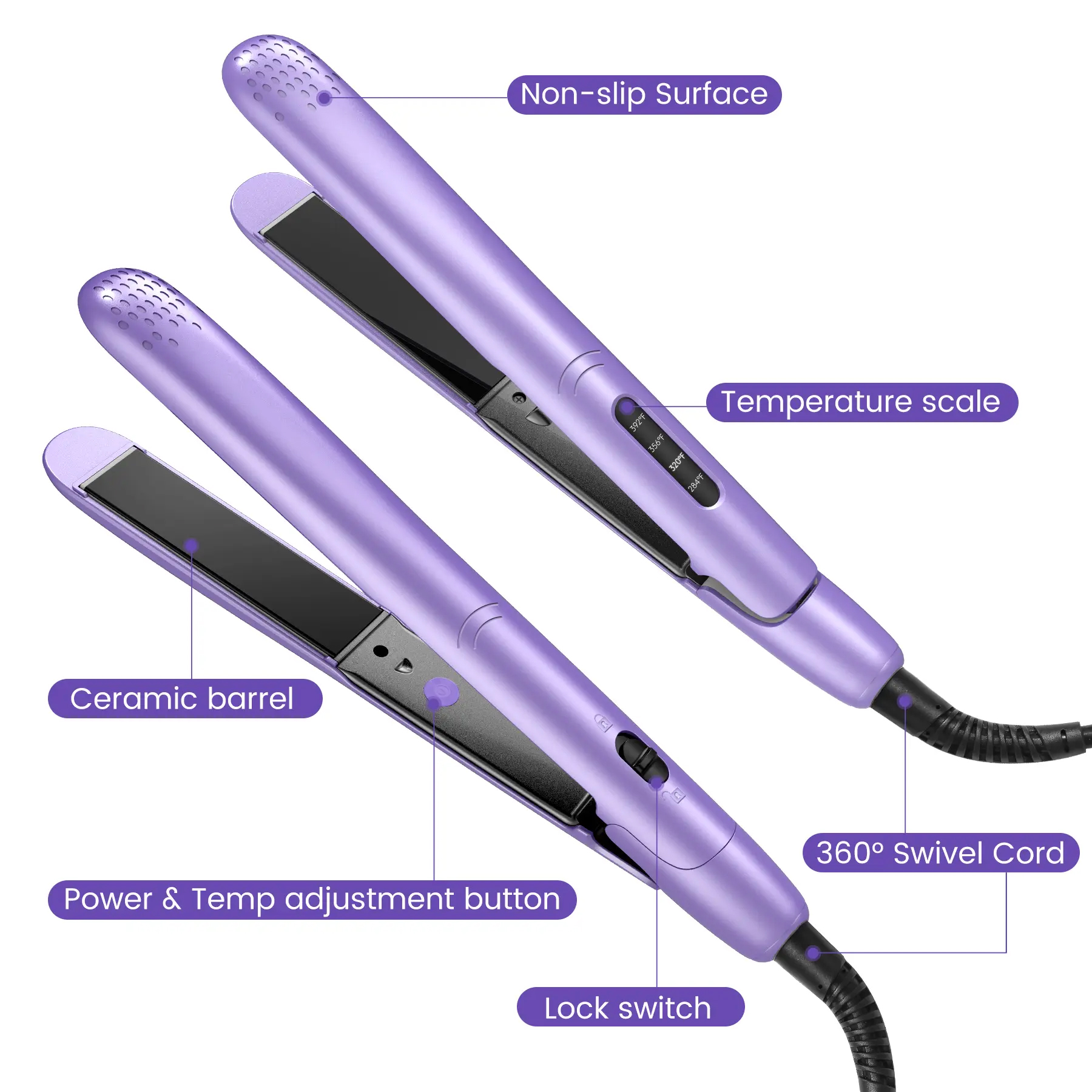 Chemicals of Very High Concern: None Power Cord Assembly Method: 360° Rotating Material: PCT Voltage: 100-110V Maximum Temperature: 200℃ Temperature Control: Knob Suitable Hair Type: Dry and Wet Hair Minimum Temperature: 140℃ Color: Lavender Size:29x4.5cm..